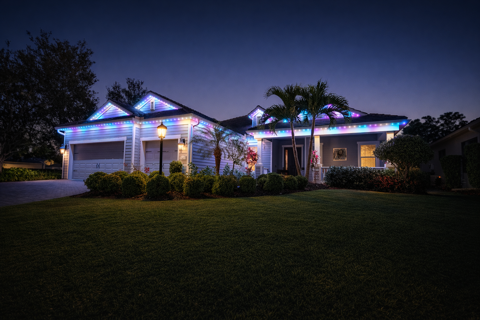 Innovative Lighting installs JellyFish® permanent exterior LED lighting built for year round use. We mount clean, low profile lights along soffits, around lanais and pool enclosures, and throughout landscape areas, then tie it all into a simple phone app. You can run a soft white glow for everyday curb appeal, set brighter scenes for security, or switch to full color for birthdays, game days, and holiday weekends. It is one system you install once, then you can change it anytime.